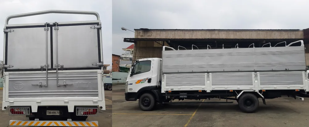 Cánh cửa mở bửng hông được thiết kế 7 bửng siêu tiện lợi,thùng dài 6.15m ,thùng được thiết kế quay tôn chắc chắn tạo sự an toàn khi vận chuyển hàng hóa