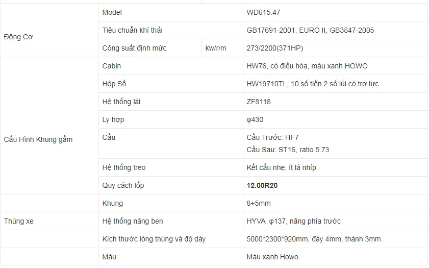- Xe ben Howo 371 dòng xe tải tự đổ 3 chân tải trọng lớn, được CNHTC sản xuất. Xe có kiểu dáng hiện đại bắt mắt, được trang bị khối động cơ WEICHAI, Công suất máy 371HP/2200rpm.tiêu chuẩn khí thải EURO II mạnh mẽ, khung gầm chắc chắn, thùng ben chịu tải, dẫn động 2 cầu giúp xe vận hành ổn định bền bỉ trên mọi cung đường. Đặc biệt giá thành phù hợp với người dùng Việt, mau thu hồi vốn. Chế độ bảo hành chính hãng