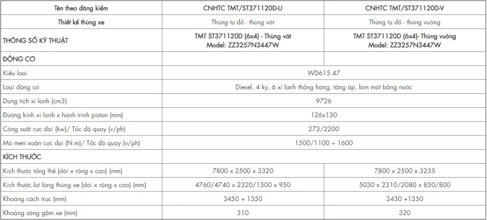 Dòng Xe ben TMT sinotruck 12 tấn mang động cơ WD165.47, 06 Xylanh, 04 kỳ tăng áp dung tích cylanh 9726cm3, có hệ thống Turbo tăng áp mạnh mẽ, sản sinh công suất cực đại lên đến 273kw
