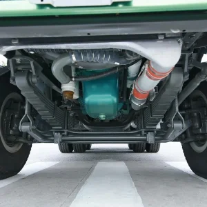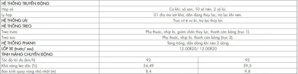 khung gầm được làm từ loại thép chuyên dụng chất lượng cao,thích nghi với mọi điều kiện thời tiết và địa hình xấu, xe sử dụng hệ thống treo trước dạng nhíp lá bán nguyệt ,nhíp trước kết hợp ống giảm chấn thủy lực giúp người ngồi trong cabin giảm được đáng kể tiếng ồn và độ rung từ phía sau khung gầm của xe , hệ thống treo sau với lá nhíp lớn , cỡ lốp 12.00-R20 đồng bộ trước sau tạo sự cân bằng và tăng khả năng chịu tải cho xe.