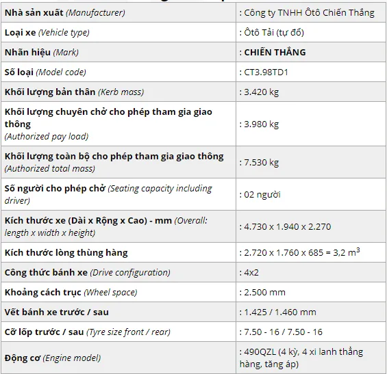 Công Ty chúng tôi đánh giá nhu cầu xe thương mại như hiện nay ở phân khúc xe tải ben nhỏ rất được ưa chuộng tại các thành phố lớn,nông thôn vào các cung đường nhỏ hẹp mà xe lớn không thể vào, nay nhà máy CHIẾN THẮNG lắp ráp từ nguồn linh kiện đạt tiêu chuẩn nhập khẩu 100% và chỉ được lắp ráp, đóng thùng và ra giấy tờ tại Việt Nam để giảm thuế đồng thời qua đó giảm giá thành của xe. xe tải ben chiến thắng 4 tấn– sử dụng động cơ 490QZL, mang lại chất lượng tuyệt vời cho sản phẩm,chắc chắn đây sẽ là sản phẩm mang đến bước ngoặc mới cho phân khúc xe tải ben Chiến Thắng 4 tấn cũng sẽ là đối thủ với các hãng khác trên thị trường hiện nay.