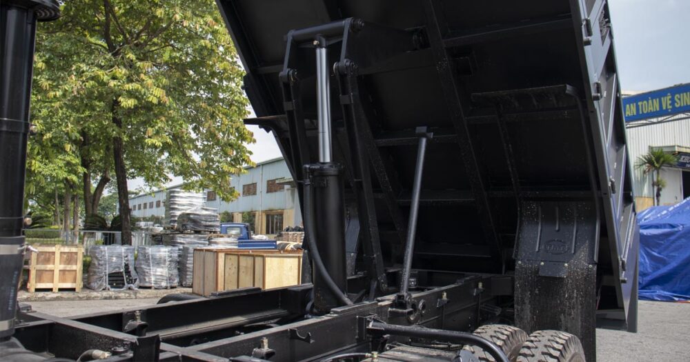cùng với thiết kế nâng hạ góc chữ A với ty ben có đường kính 160mm được thiết kế góc đặt lực chắc chắn và gọn hơn, chính vì thế hệ hệ thống nâng hạ lên gấp đôi tải trọng cho phép nhưng vẫn đảm bảo sự chịu lực của ty ben thủy lực. Với thiết kế lòng thùng hàng: 3760 x 2290 x 750 mm cho lòng thùng chở được 6.5 khối