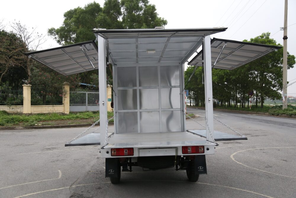 thiết kế mẫu thùng và khung xương chịu lực mở cánh chắc chắc, mở tổng cổng đến 6 vỉ bung hướng ra ngoài vừa để được nhiều hàng và che mát .Tải trọng cho phép chở mẫu thùng lững này lên đến 920 kg nên cho phép khách hàng thoải mái trưng bày và chở hàng
